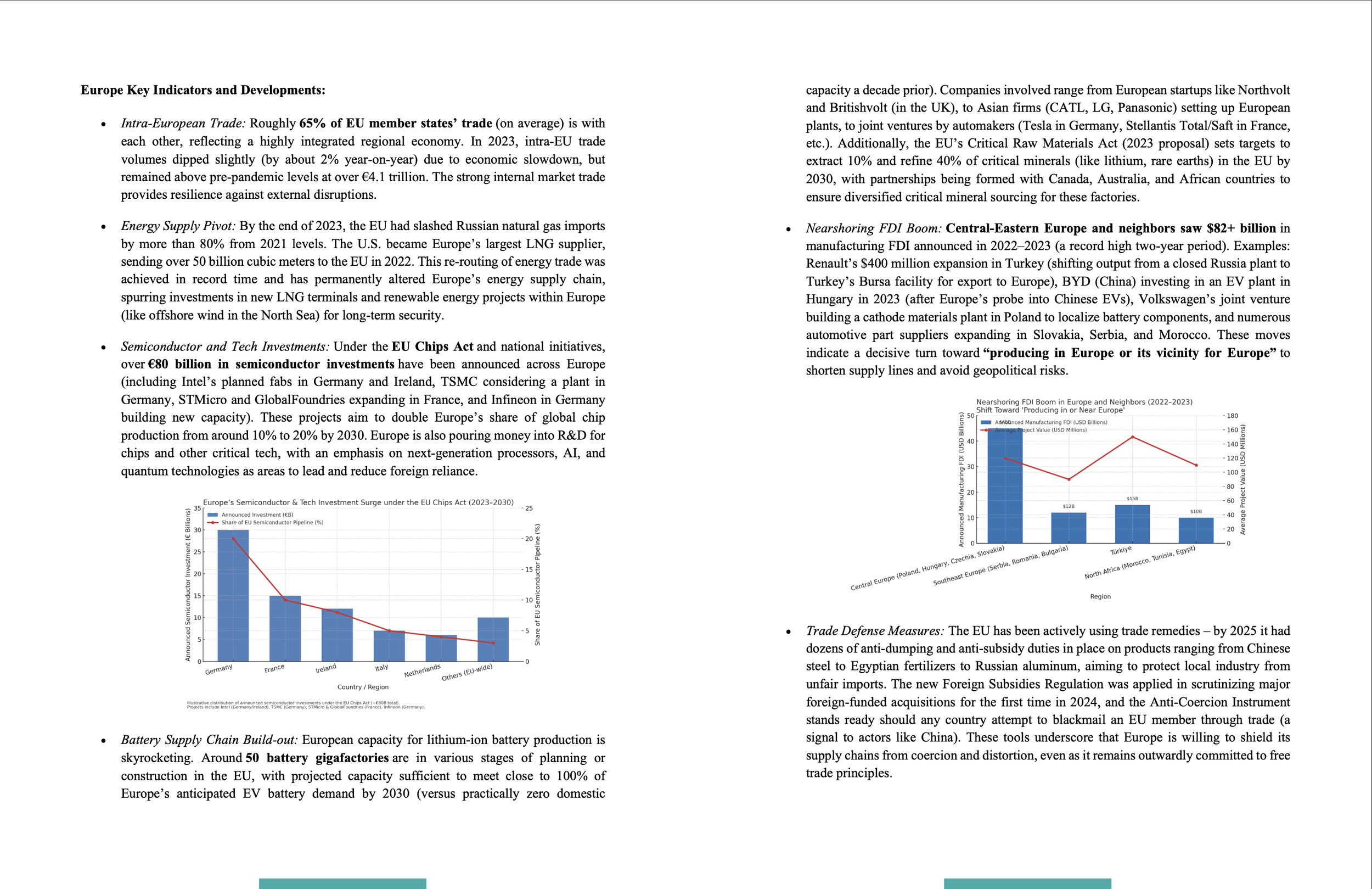 This report analyzes the accelerating shift from globalized to regionalized production systems, with a focus on North America, Southeast Asia (ASEAN), and Europe. It explores how trade wars, pandemics, and geopolitical realignments are reshaping supply chains toward nearshoring and friend-shoring strategies. Using trade data and policy analysis, the study highlights new industrial patterns—from U.S. reshoring incentives and Mexico’s manufacturing boom to ASEAN’s rise as a “China+1” hub and Europe’s regulatory-led localization efforts. The report concludes with a forward outlook on how regional blocs will redefine global commerce, resilience, and competitiveness through 2030.