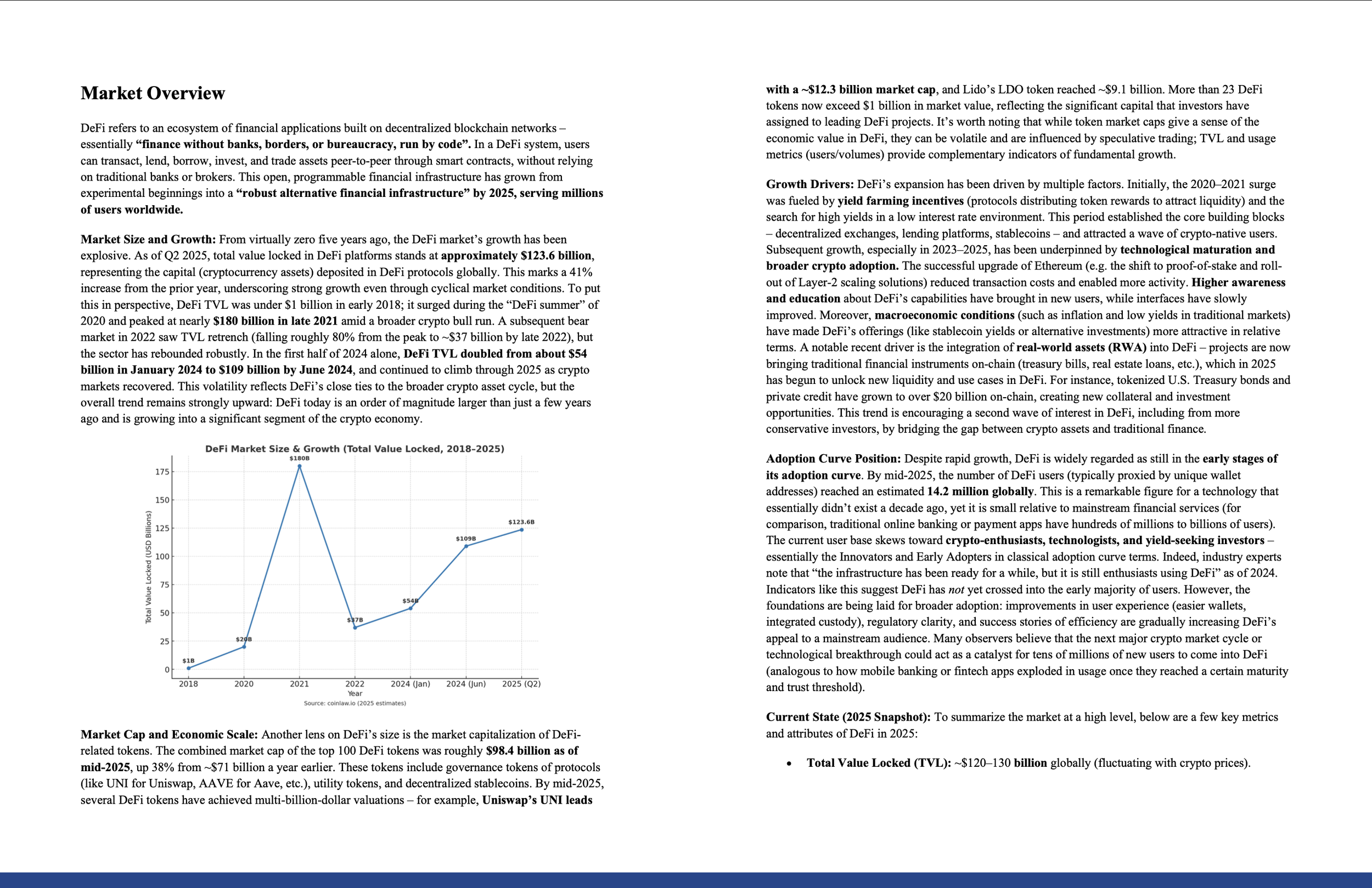 A comprehensive examination of the decentralized finance (DeFi) ecosystem as it matures into a global alternative financial infrastructure. Covering $120 billion in total value locked and over 14 million active users as of 2025, this report maps DeFi’s rapid expansion, core technologies, and emerging institutional participation. It includes deep dives into lending, staking, stablecoins, and tokenized real-world assets, alongside an analysis of regulatory trends across major regions. Designed for investors, analysts, and financial strategists, this study provides a data-driven forecast for DeFi’s growth trajectory, potential risks, and pathways toward mainstream integration.